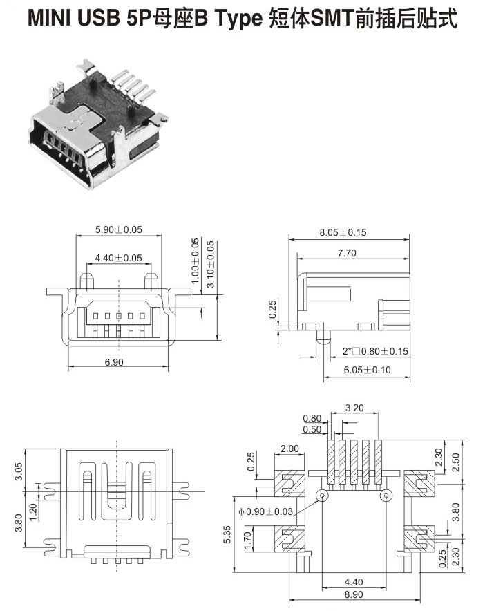 MIMI USB 5P母座 B Type 短體SMT前插后貼式