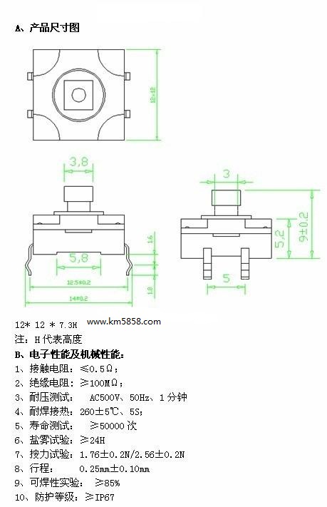 詳細介紹: 防水輕觸開關KM1212插腳 本產(chǎn)品廣泛用于,玩具,電動玩具,玩具公仔,防盜器,家用電器,手機數(shù)碼,電子通訊,電子游戲機,汽車防盜,智能化系統(tǒng),電視機、MP3、耳機,等電腦通訊器材